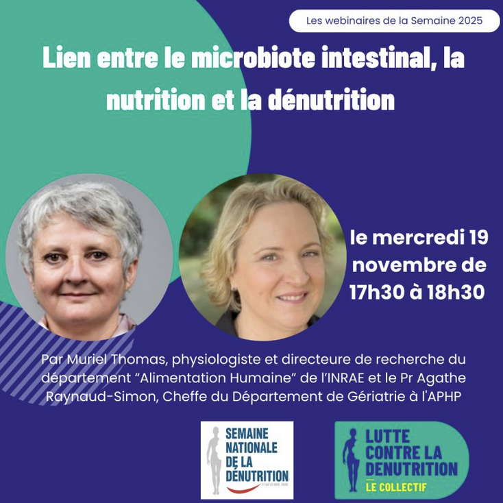Webinaire "𝗟𝗶𝗲𝗻 𝗲𝗻𝘁𝗿𝗲 𝗹𝗲 𝗺𝗶𝗰𝗿𝗼𝗯𝗶𝗼𝘁𝗲 𝗶𝗻𝘁𝗲𝘀𝘁𝗶𝗻𝗮𝗹, 𝗹𝗮 𝗻𝘂𝘁𝗿𝗶𝘁𝗶𝗼𝗻 𝗲𝘁 𝗹𝗮 𝗱é𝗻𝘂𝘁𝗿𝗶𝘁𝗶𝗼𝗻" proposé par le Collectif de lutte contre la dénutrition dans le cadre de la 6è édition de la Semaine de la dénutrition.