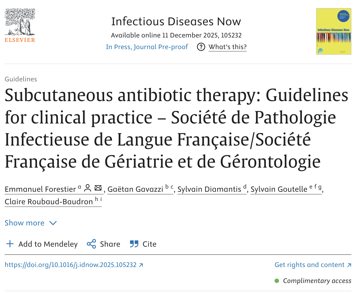 - The relevant data are summarized in this article, and guidelines are issued on behalf of the SPILF and the SFGG to define the indications, modalities of use, and regulatory framework for subcutaneous antibiotic therapy.